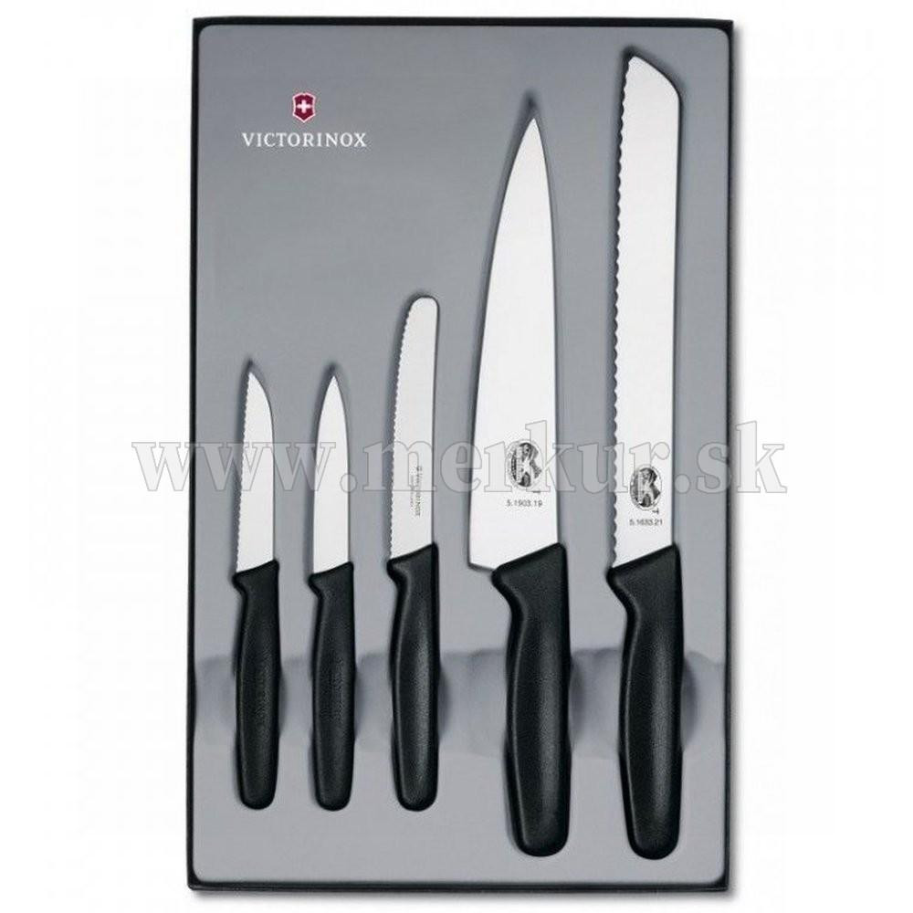 Súprava 5-tich kuchynských nožov Victorinox, ktoré majú čepele z nehrdzavejúcej ocele a rukoväte z čierneho polypropylénu.