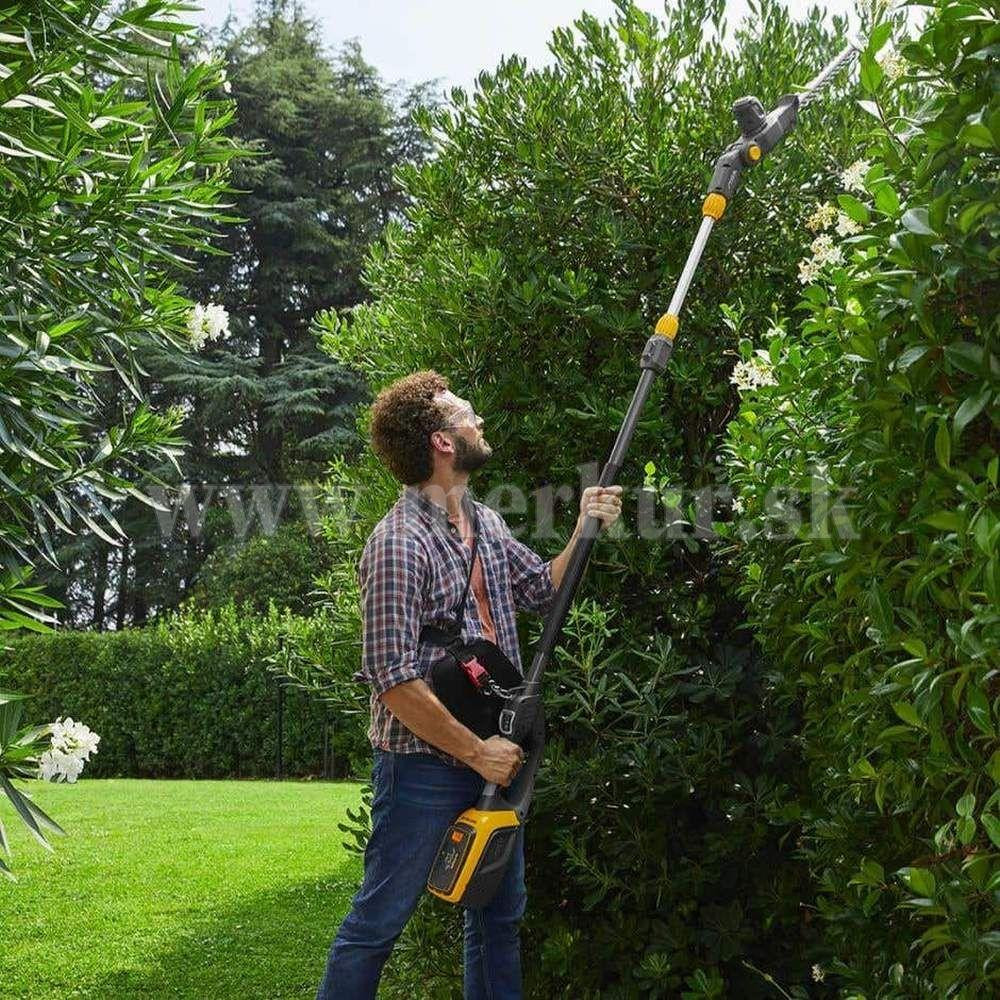 Odolná 46 cm dvojčinná čepeľ nožníc a 25 cm rezná lišta píly, budú hladko strihať a rezať vegetáciu na Vašej záhrade. K údržbe vysokých stromov a živých plotov je tento záhradný multifunkčný nástroj vybavený 65 cm teleskopickým predĺžením, ktoré Vám poskytne maximálnu dosiahnuteľnú výšku 4,3 m s nožnicami na živé ploty a 4 m s prerezávacou pílou.