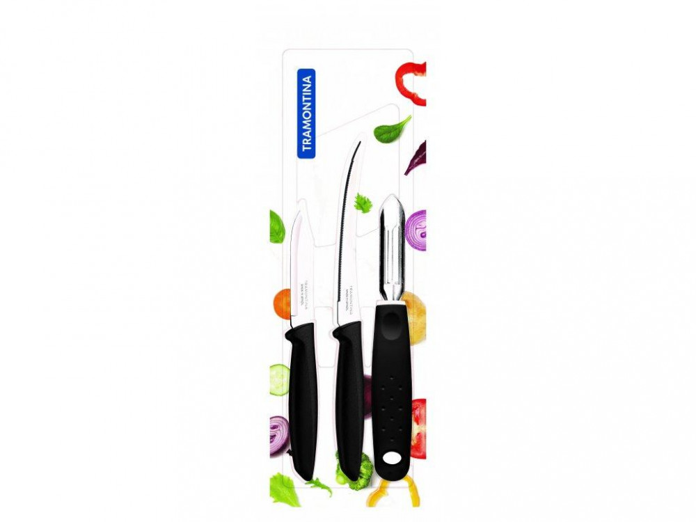 Set nožov Plenus od brazílskej značky Tramontina obsahuje dva praktické nože - nôž na ovocie a zeleninu, zúbkovaný nôž na rajčiny a škrabku na zemiaky. Ich čepele sú z nehrdzavejúcej ocele a sú podrobené tepelnému testovaniu, aby malo ostrie čo najdlhšiu životnosť. Čierne polypropylénové rukoväte sú praktické pre uchopenie. Tento set ponúka výbornú kvalitu za skutočne nízku cenu. Nože sa ľahko skladujú a čistia. Sú vhodné do umývačky riadu.