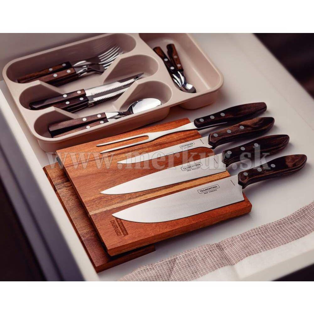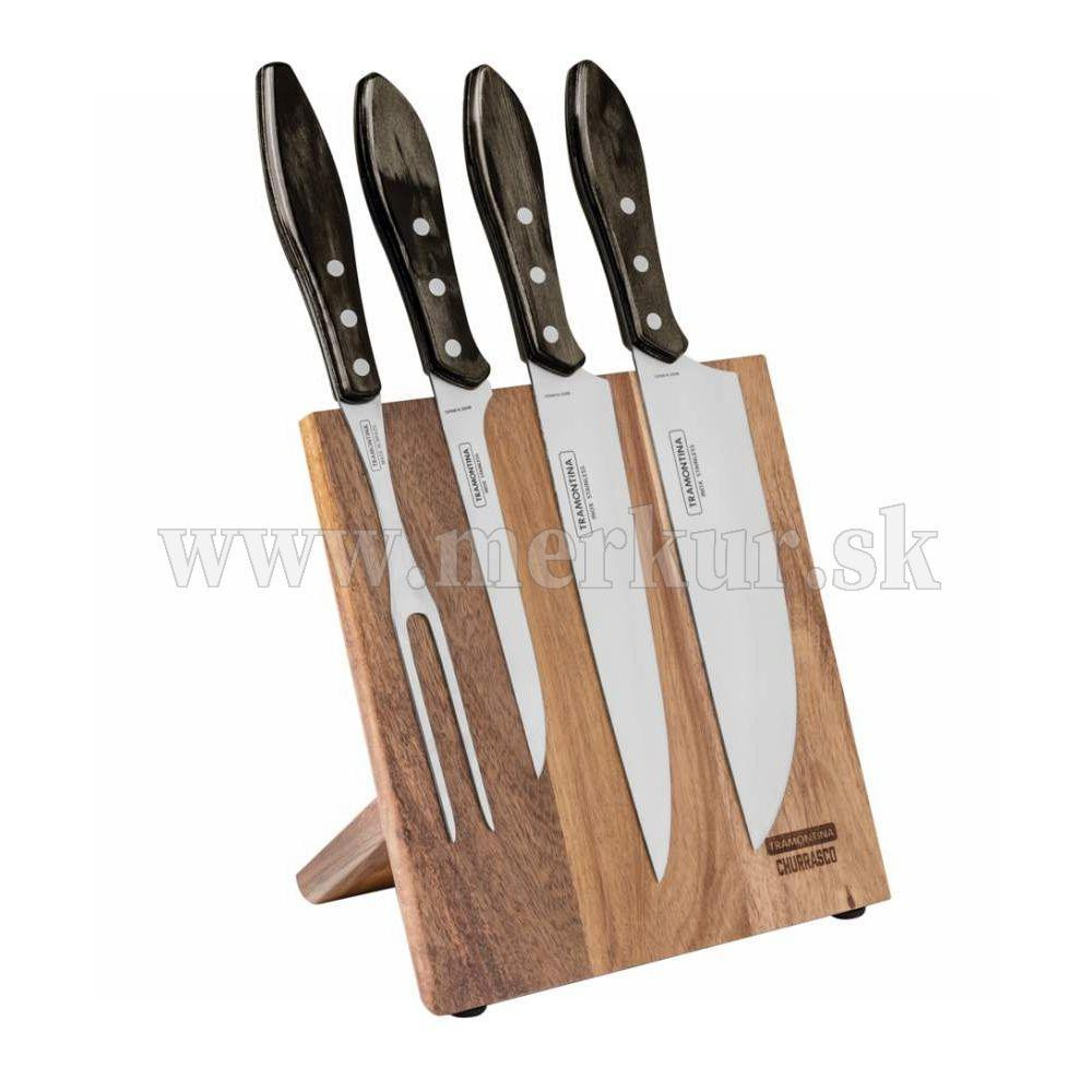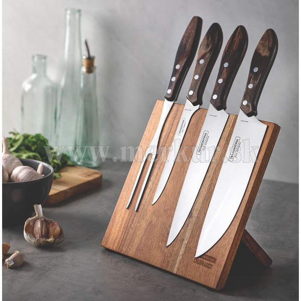 Sada kuchynských nožov s magnetickým dreveným stojanom od brazílskeho výrobcu Tramontina sa stane atraktívnym doplnokom Vašej kuchyne. Čepeľ nožov je vyrobená z nehrdzavejúcej ocele. Ostré čepele zabezpečujú perfektný rez. Drevená rukoväť je špeciálne upravená. Táto úprava rukoväte zabezpečuje nožom vysokú odolnosť proti nárazom a tiež proti vysokým teplotám, takže sú vhodné aj do umývačky riadu. Ideálne pre bežné používanie, ale aj pre servírovanie Vášho obľúbeného BBQ. Súčasťou balenia je praktická vidlica. Táto sada obsahuje model pre každú fázu prípravy jedla - od čistenia až po krájanie upečeného mäsa.