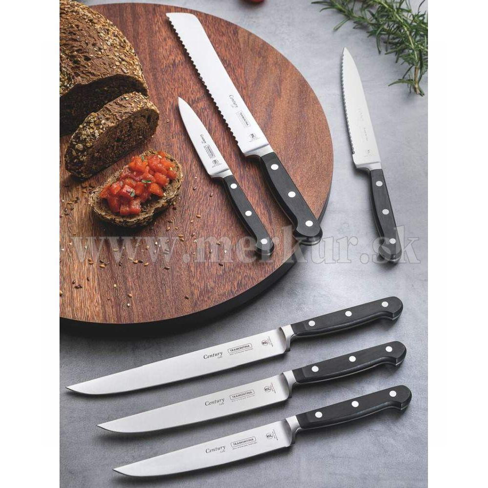 Nože z rady Century od značky Tramontina boli špeciálne vyvinuté pre intenzívne používanie. Ich kvalitu ocenia profesionálni kuchári, ale aj milovníci varenia v domácnosti. Vďaka inovatívnej technológii sú nože Century pripravené odviesť svoju prácu na 100%. Veľkosti ponúkaných nožov sú najčastejšie používané v gastronomickom priemysle, preto ich využijete pri každej fáze prípravy pokrmov. Od krájania a vykosťovania surového mäsa, až po krájanie ovocia, zeleniny, pečiva alebo upečeného mäsa. Ich kvalita a dlhovekosť spočíva vo výrobe z jedného kusa ocele tzv. ,,Monobloc". Vysoká kvalita nožov je výsledkom tepelného spracovania, ktorá pozostáva z kalenia (zahrievanie čepele), následne ochladení pod nulou (chladenie od 50 do -196 stupňov) a temperovania (zvyšovanie pružnosti ocele) pre dlhšiu a efektívnejšiu životnosť. Anatomická a ergonomická rukoväť ponúka bezpečnosť počas používania. Rukoväť je vyrobená z polykarbonátu a sklenených vlákien. Je priamo vstrekovaná do oceľovej podložky a ukončená tromi hliníkovými nitmi. Zároveň je ošetrená antimikrobiálnou ochranou, ktorá zabraňuje a obmedzuje množeniu baktérií a plesní. Century línia má 25-ročnú záruku na výrobné chyby a je certifikovaný NSF - Národnou sanitárnou nadáciou. Nože sa ľahko skladujú a čistia. Sú vhodné do umývačky riadu.