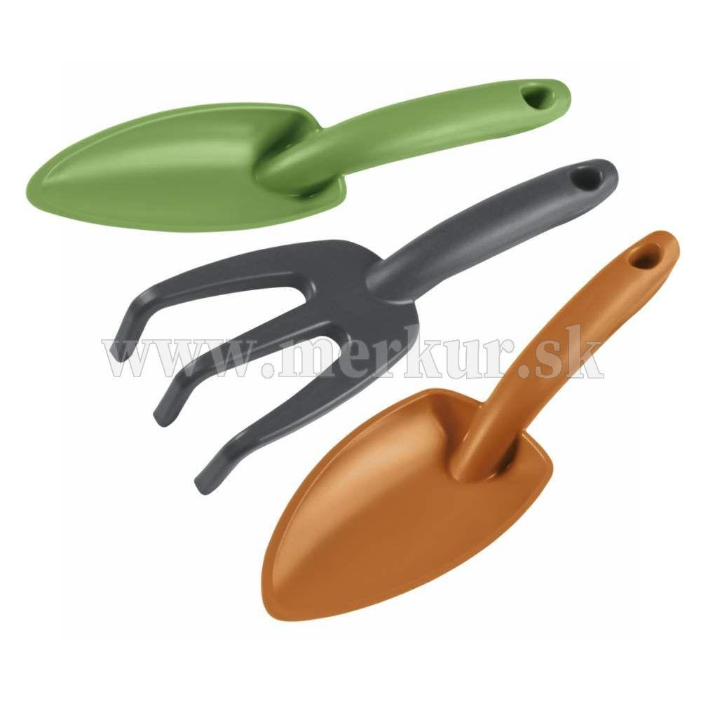 Sada záhradného náradia nesmie chýbať vo výbave žiadneho záhradkára. Obsahuje tri univerzálne a najčastejšie používané náradia - záhradnú lopatku, výsadbovú lopatku a záhradné hrabličky. Vyrobené sú z kvalitného a pevného plastu s ergonomickými rukoväťami vybavenými praktickými dierami na zavesenie. Ideálna veľkosť a nízka hmotnosť zaručia jednoduchosť používania nie len v záhradách, ale aj na menších plochách akými je napríklad záhon alebo balkón.
