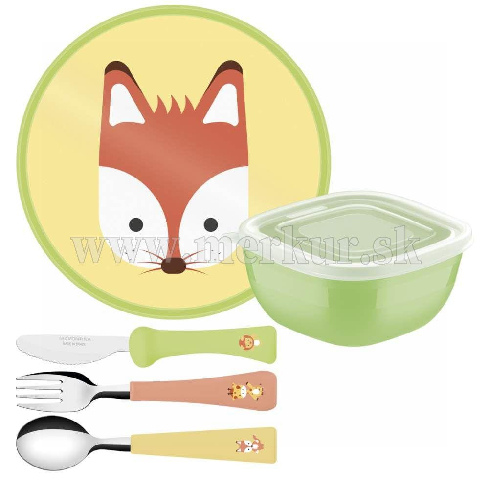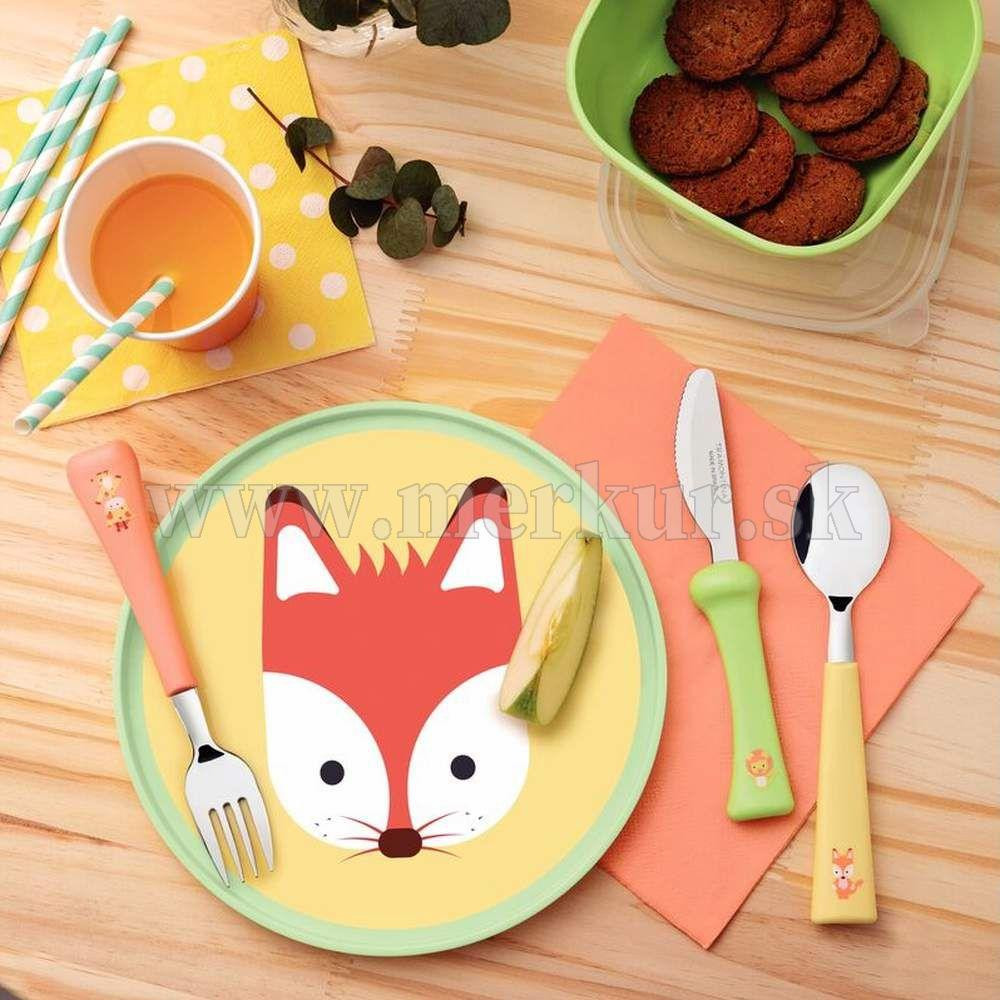 Detský 5-dielny jedálenský set poteší nie len rodiča, ale svojim hravým dizajnom aj každé dieťatko. Vyrobený je z nehrdzavejúcej ocele a polypropylénu bez BPA s antimikrobiálnou ochranou. Rukoväte príboru sú ergonomicky tvarované a ľahko sa nimi manipuluje. Jeho dizajn ako aj vizuál tanierika je doplnený o detský vzor v podobe zvieratiek. Vhodné pre deti od troch rokov.