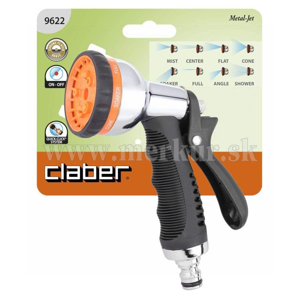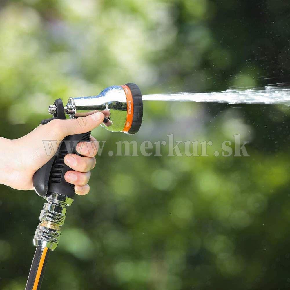 Multifunkčná pištoľ z pochrómovaného kovu a mosadze. Gumová ergonomická rukoväť. Páčka na ovládanie prietoku vody pre požadovaný prúd. Otočením prstencovej matice získate 8 rôznych typov striekania. Quick-Click spojka.