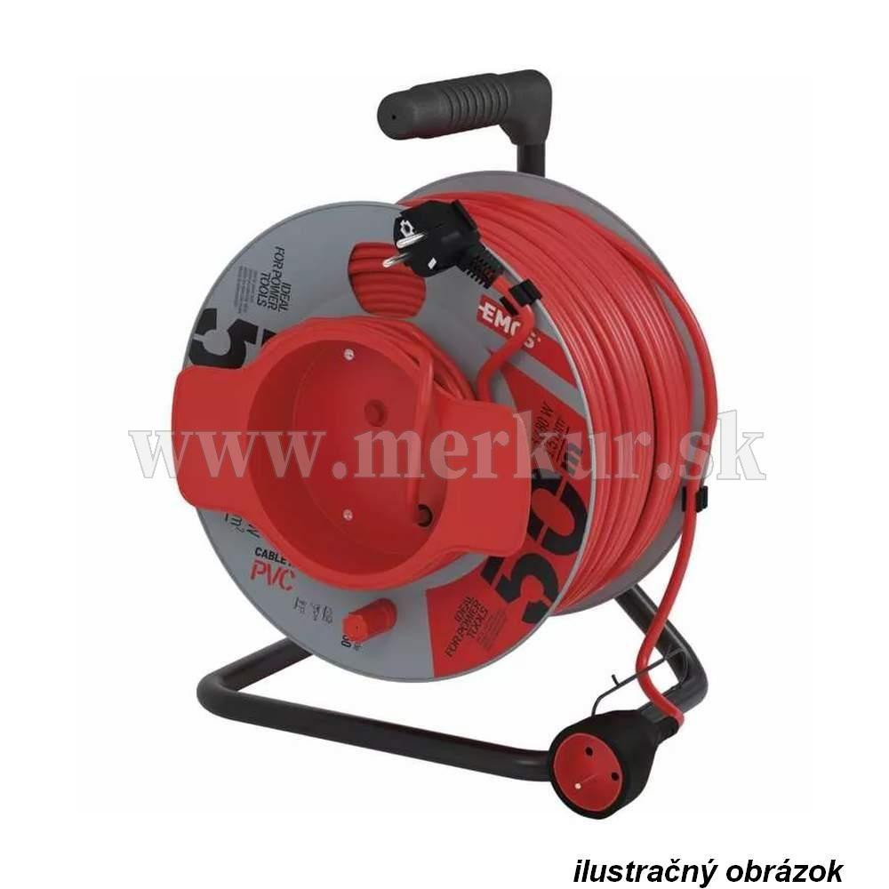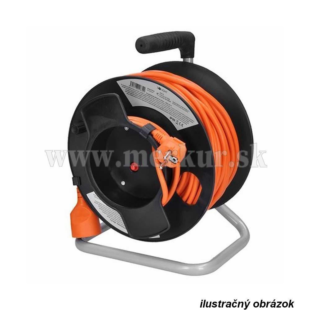 Oranžový/červený predlžovací kábel na bubne - spojka s dĺžkou 50 m, prierezom vodiča 1,5 mm2 a tepelnou poistkou. Vhodný pre maximálnu záťaž 16 A max. / 3680 W pri plne rozvinutom stave a 4,8 A max. / 1100 W navinutý.