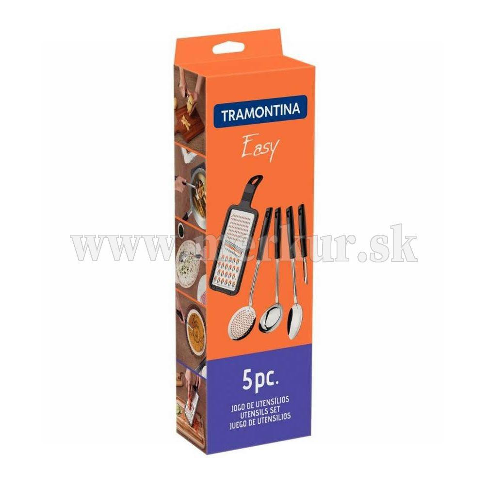 Sada kuchynského náradia zo série Easy od brazílskej značky Tramontina obsahuje všetky nevyhnutné náčinia potrebné pre vašu kuchyňu. Produkty sú vyrobené z odolnej nehrdzavejúcej ocele a rukoväte z polypropylénu, v ktorých je zabudovaná dierka. Vďaka nej si môžete náradie pohodlne zavesiť na miesto, kde ho budete mať vždy poruke. Strúhadlo obsahuje navyše silikónové nožičky, ktoré zabezpečia jeho stabilitu pri strúhaní. Všetky sa ľahko čistia a sú vhodné do umývačky riadu.