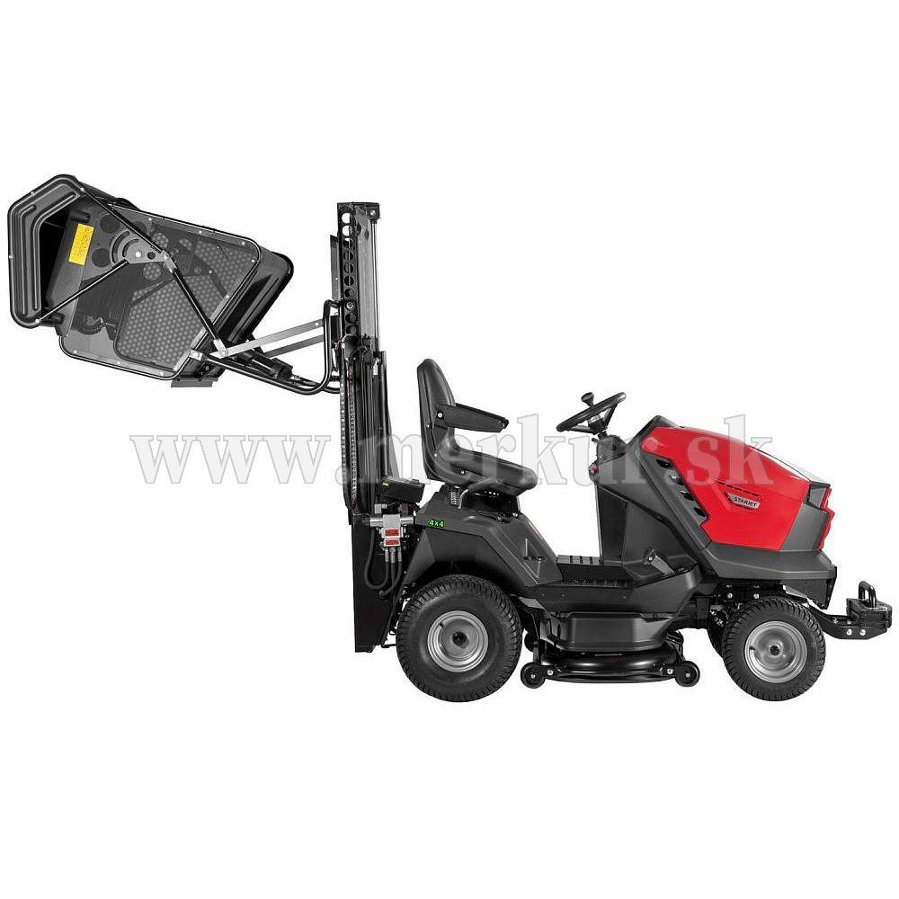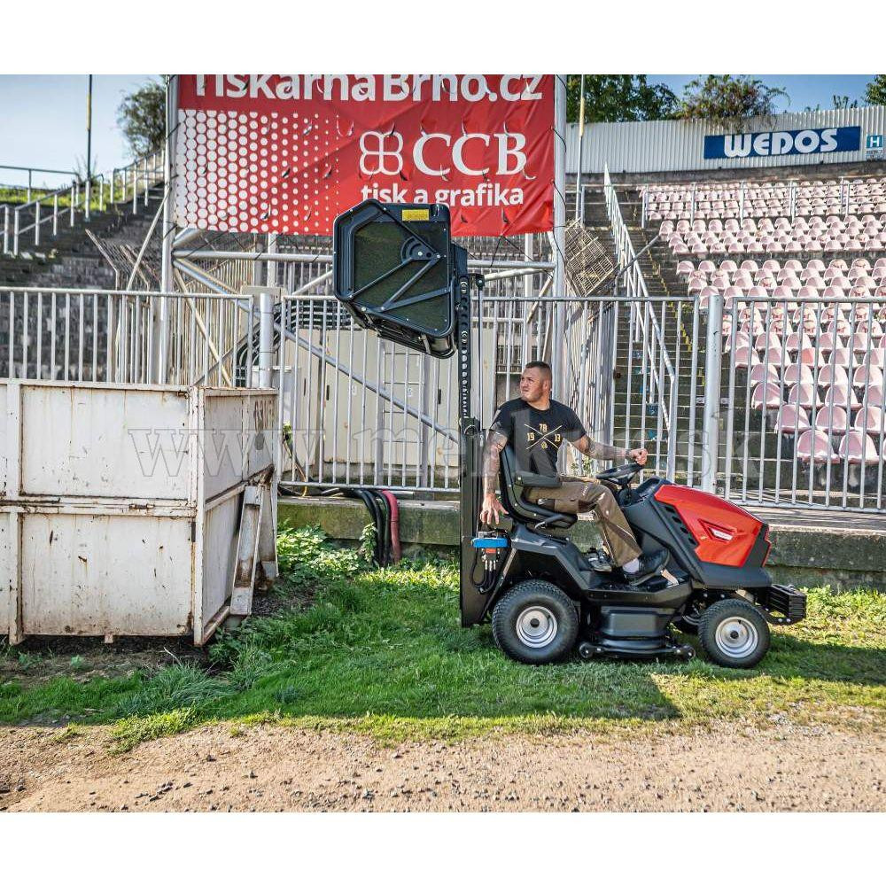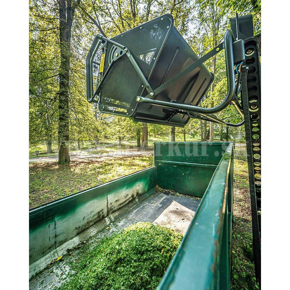 Stroj má vysokodvižný zberný kôš, ktorý vysýpa na zem alebo do kontajnera.