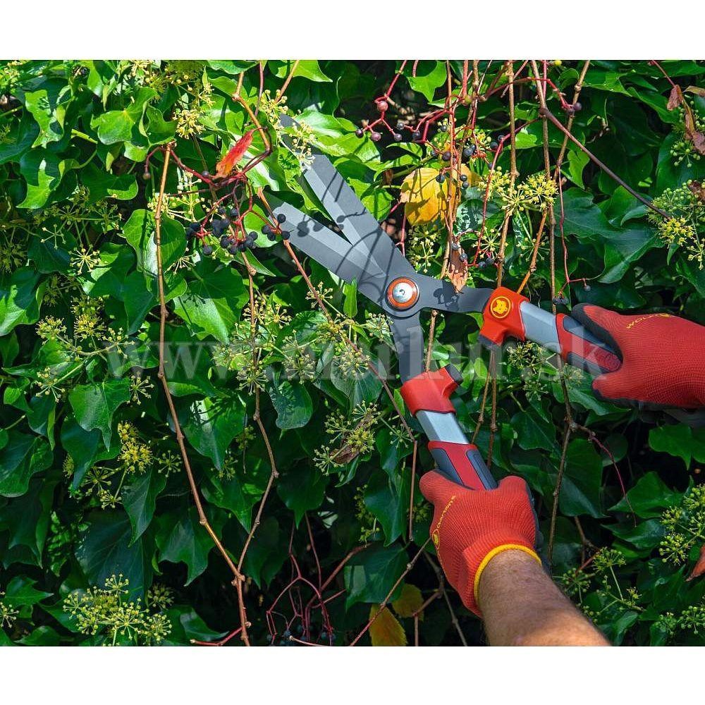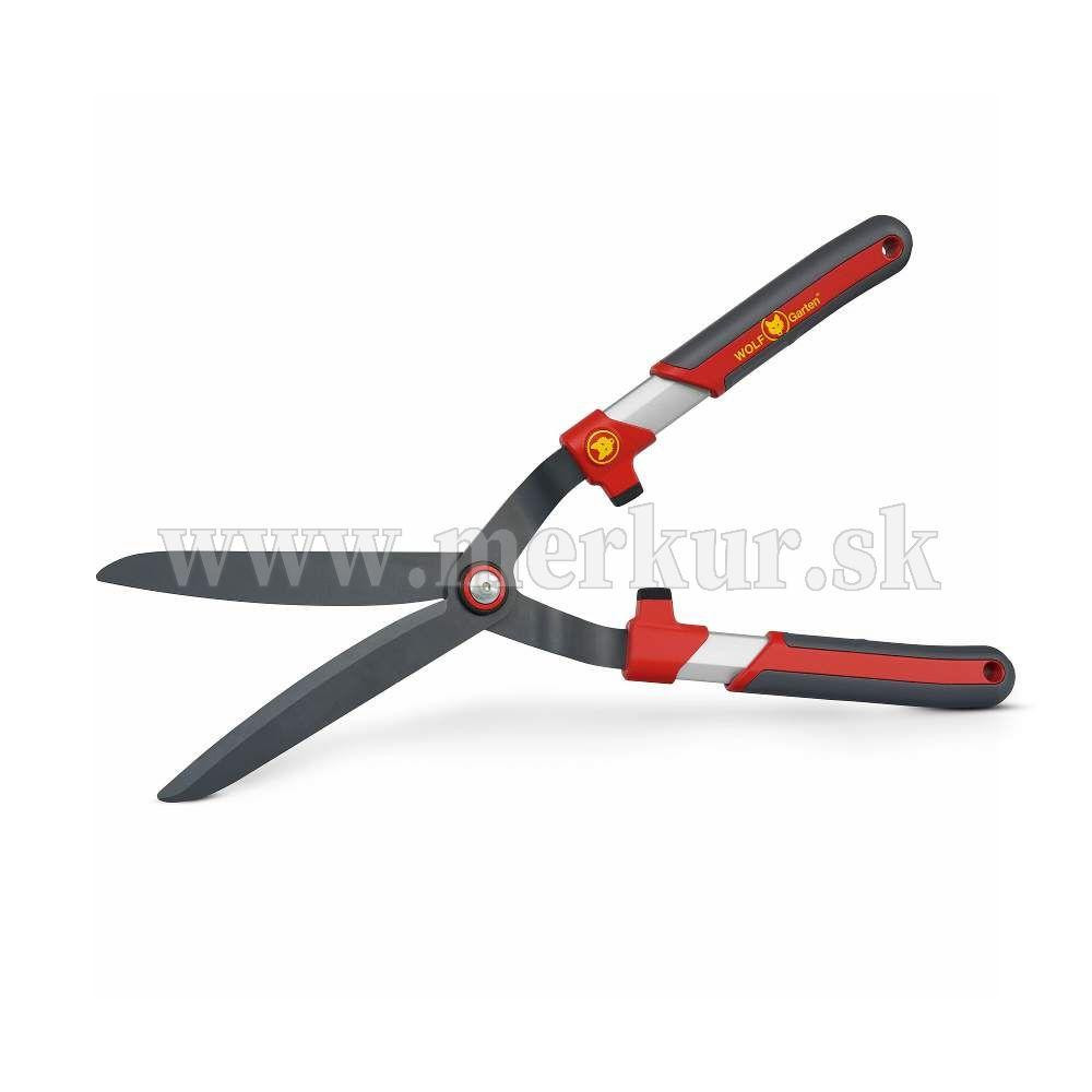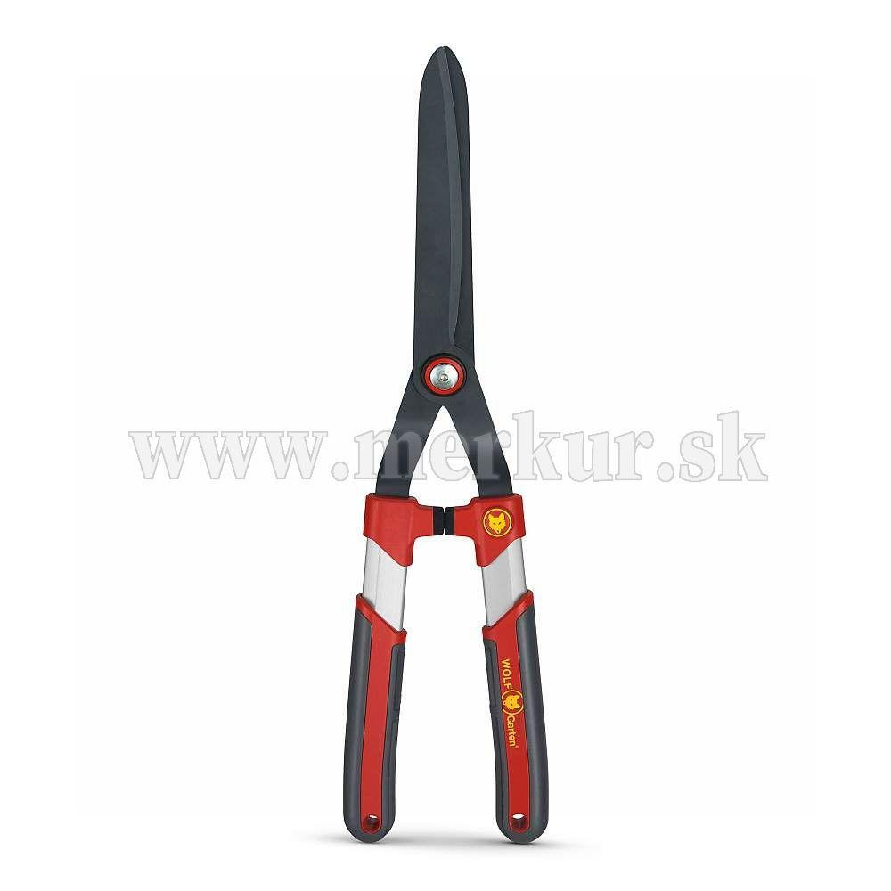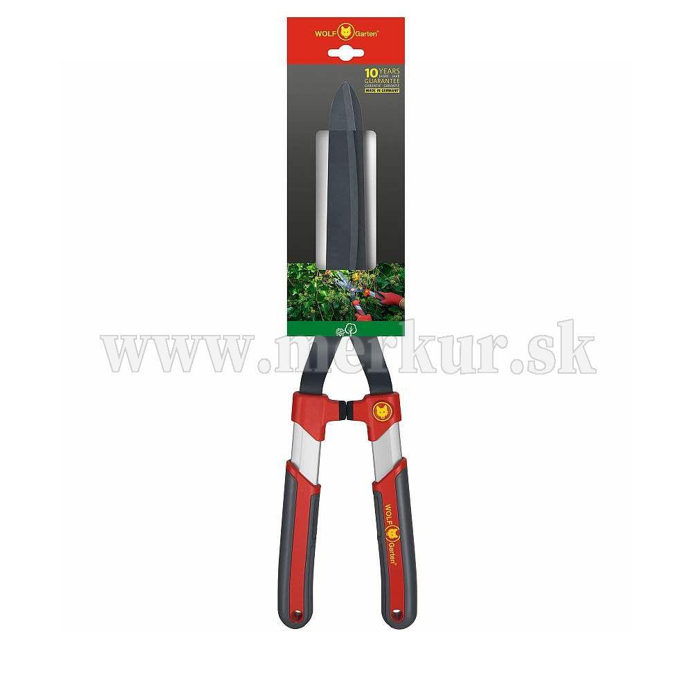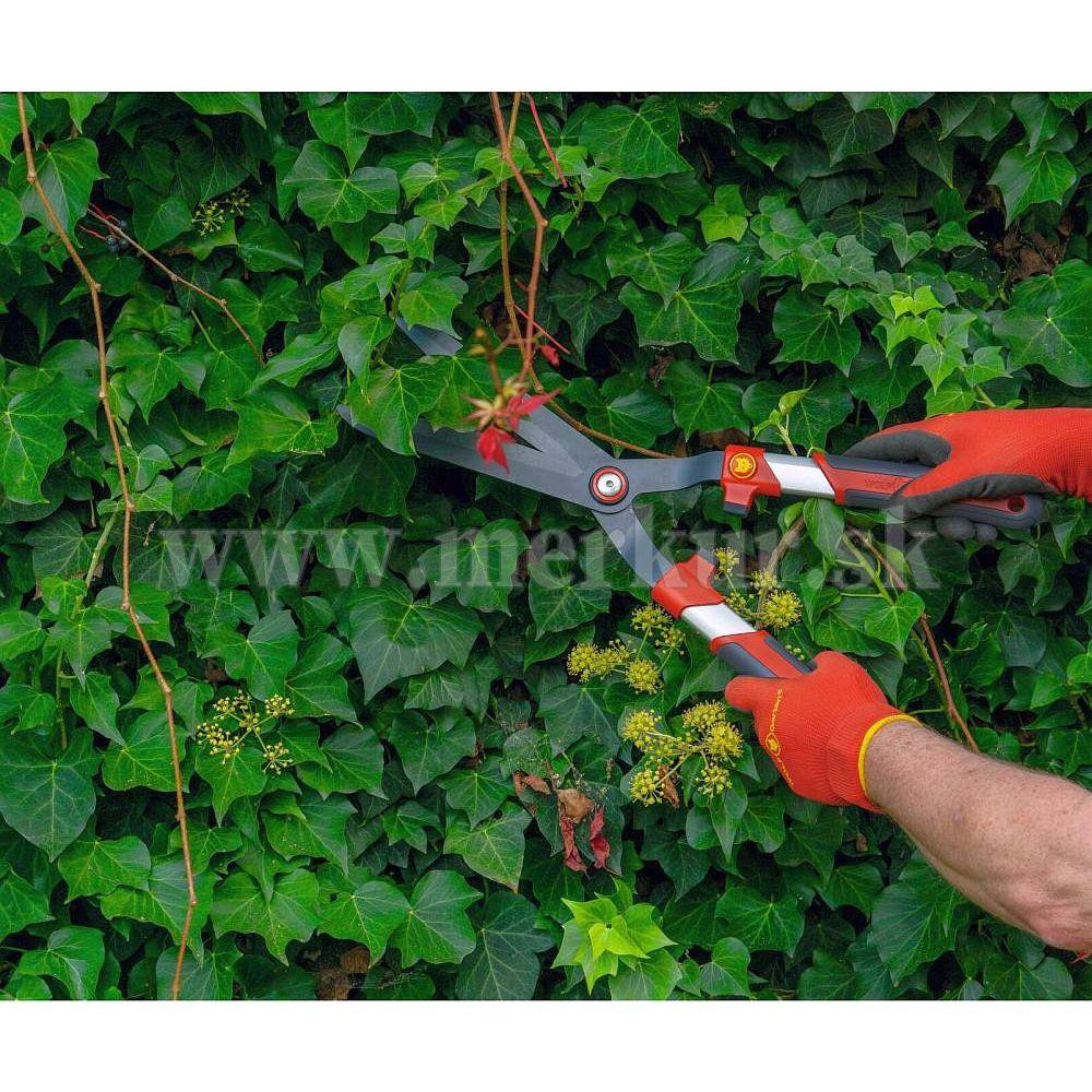 Nožnice na živý plot so zakrivenými, dvojito brúsenými a potiahnutými čepeľami a hliníkovo-plastovou rukoväťou pre pohodlnú prácu.