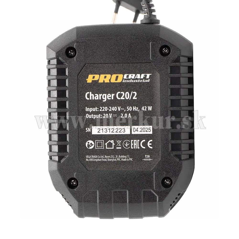 Nabíjačka Procraft Industrial C20/2 je výkonné a spoľahlivé zariadenie určené na rýchle a efektívne nabíjanie akumulátorov zo série 20V Procraft.