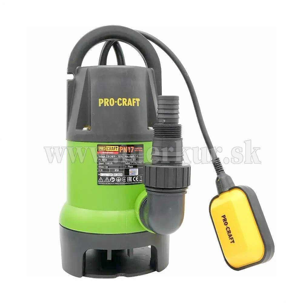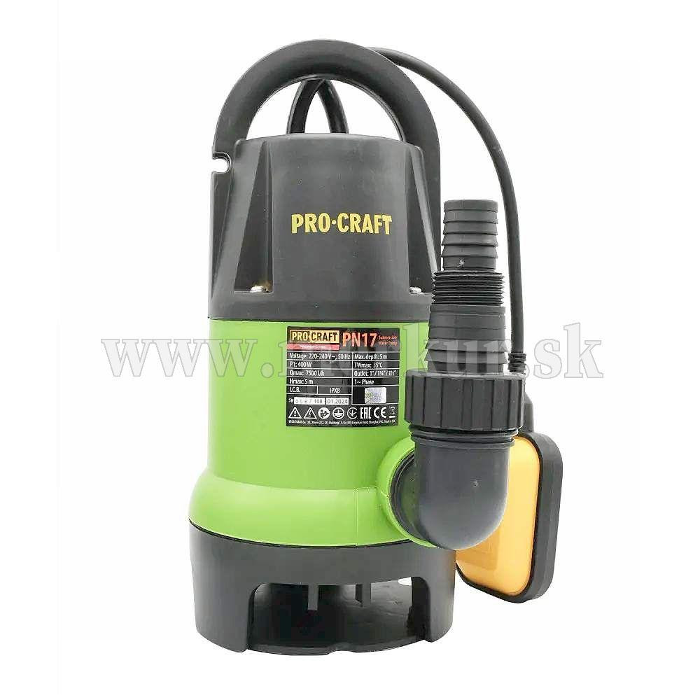 Ponorné kalové čerpadlo Procraft PN17 je určené na čerpanie čistej a znečistenej vody s malými časťami z nádrže, jazierka, rybníka. Motor s výkonom 400 W zaručuje výkon 7500 litrov za hodinu čistej a znečistenej vody do 5 m. Ponorenie je možné až do 5 metrov a dokáže vysať mäkké nečistoty do 35 mm. Plavákový spínač automaticky zapína a vypína čerpadlo podľa hladiny vody. Čerpadlo je vybavené tepelnou poistkou proti preťaženiu, ktorá sa vypne pri 36 °C. Súčasťou čerpadla je 10 m dlhý prívodný kábel s vidlicou. Kartónové balenie.