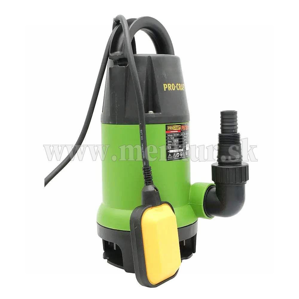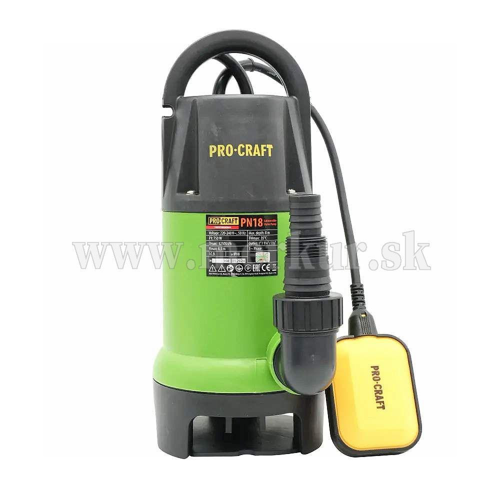 Vodné čerpadlo Procraft PN18 je určené na čerpanie čistej a znečistenej vody s malými časťami z nádrže, jazierka, rybníka. Výkonný 750W motor zaručuje výkon 12500 litrov za hodinu čistej a znečistenej vody do hĺbky 8 m a dokáže vysať mäkké nečistoty do 35 mm. Plavákový spínač automaticky zapína a vypína čerpadlo podľa hladiny vody. Čerpadlo je vybavené bezpečnostným zariadením proti tepelnému preťaženiu, ktoré sa vypne pri teplote 36 °C. Súčasťou čerpadla je 10 m dlhý prívodný kábel s vidlicou. Kartónové balenie.