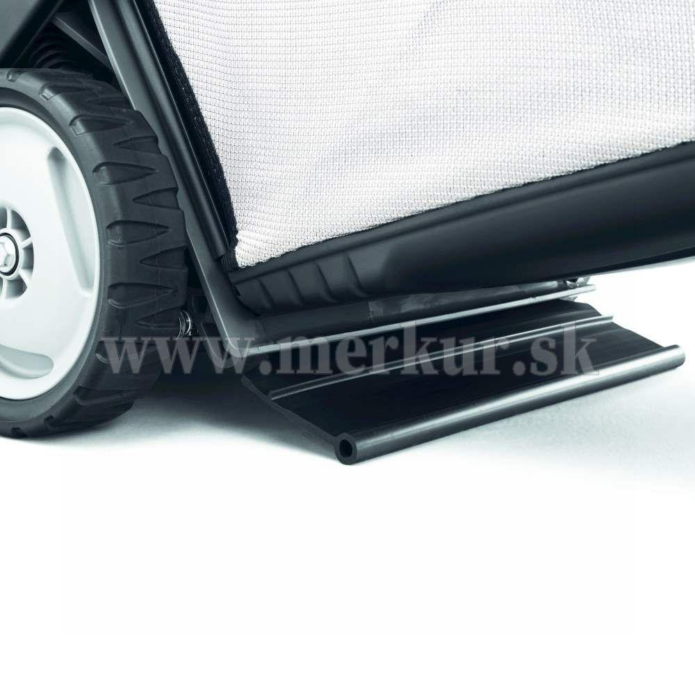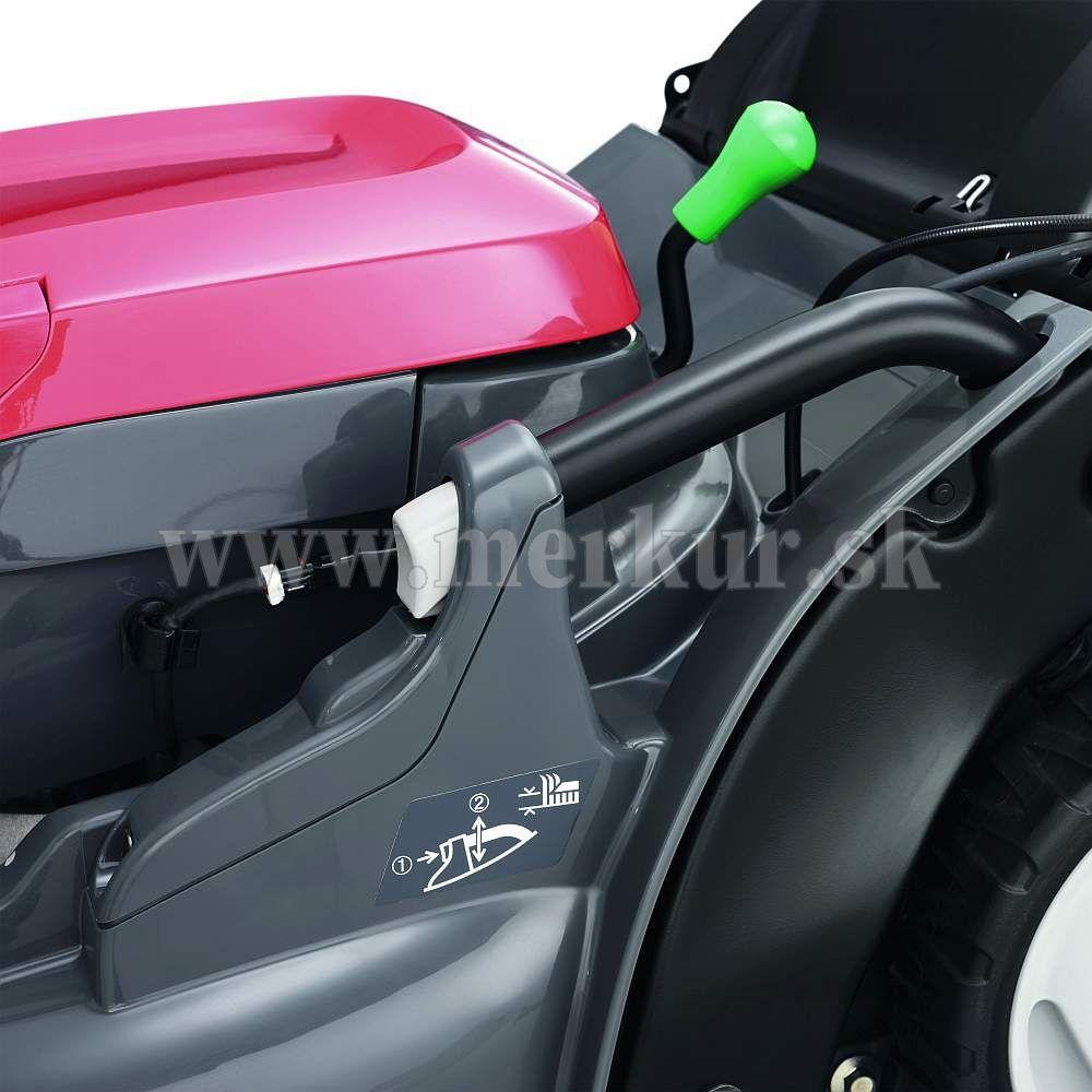 Výškovo nastaviteľná ovládacia rukoväť sa prispôsobí výške postavy. Zmenu výšky kosenia vykonáte jednoducho a v rýchlosti pomocou jedinej páky s aretáciou v 7 polohách. Kompaktné rozmery a vyváženosť stroja umožňujú vynikajúcu ovládateľnosť kosačky v členitom teréne.