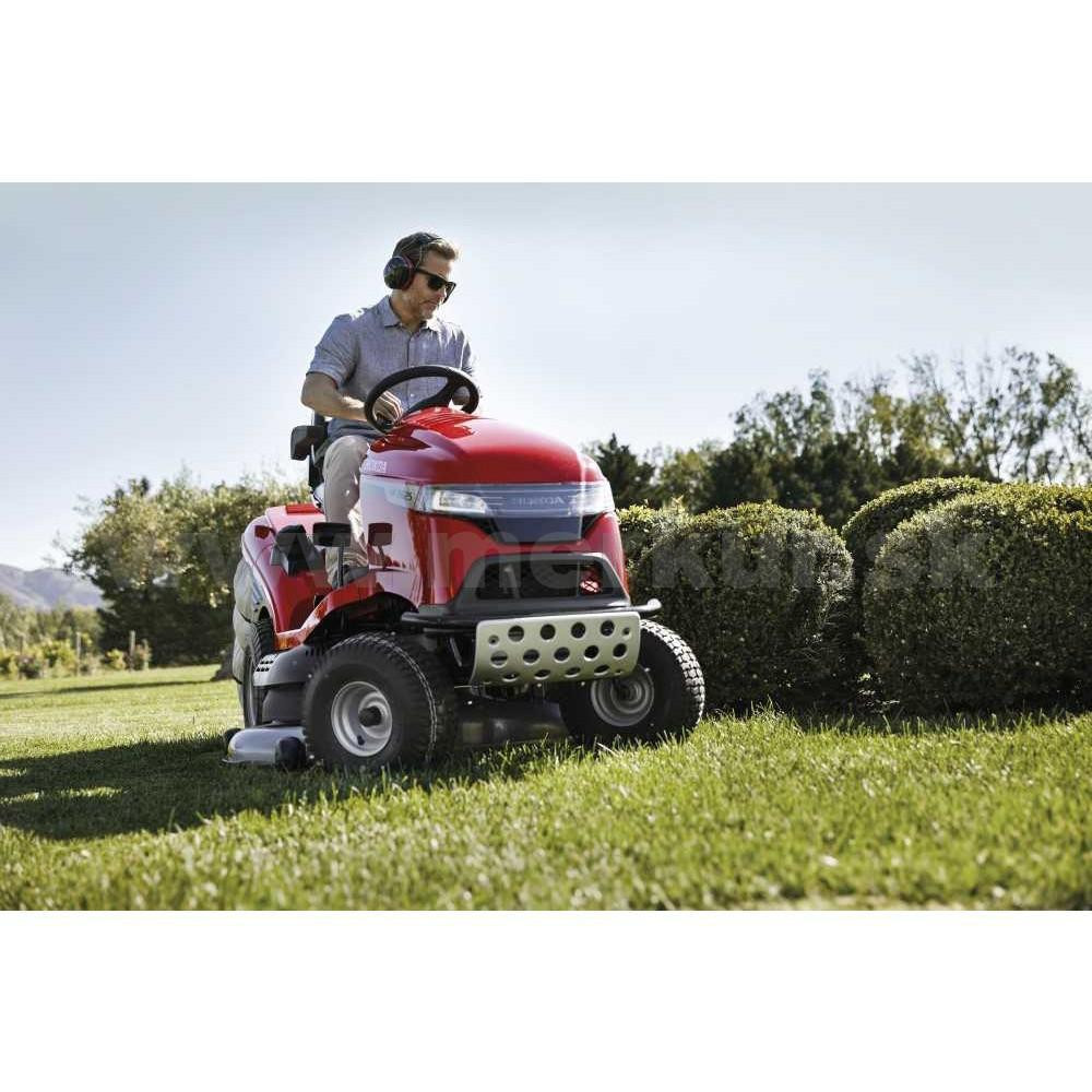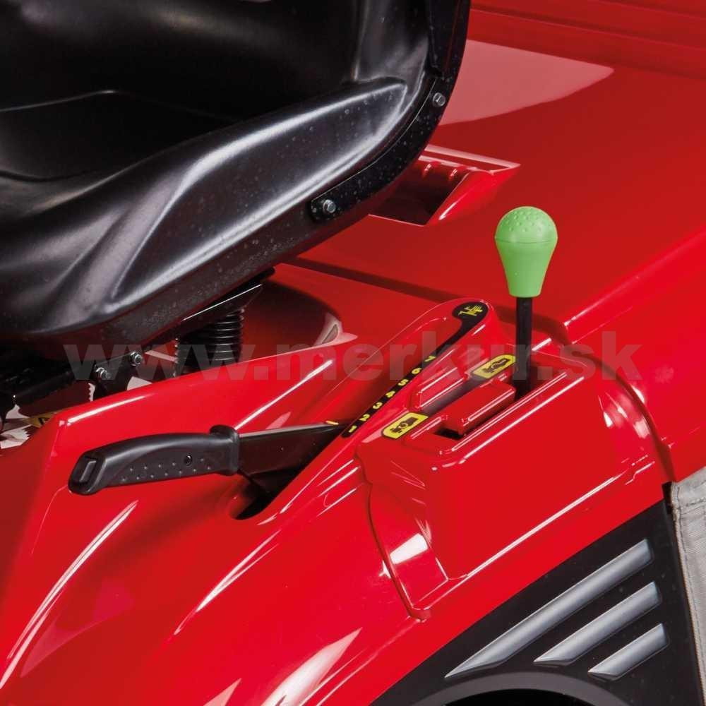 S kosením o zábere 122 cm si poradí s likvidáciou trávneho porastu aj na ploche s veľkosťou niekoľko tisíc metrov štvorcových a pritom nič nestráca na svojej obratnosti a možno s ním manévrovať aj na pomerne členitých záhradách či plochách. Tomu prispieva aj spôsob ovládania rýchlosti jazdy, kedy podľa miery stlačenia pojazdového pedála plynule regulujete rýchlosť od nuly do cca 8,2 km/hod. Avšak ani na veľmi rozľahlých trávnikoch, ako je napríklad futbalové ihrisko, nebudete unavení. Traktor je opatrený 4 stupňovým tempomatom, ktorý automaticky udržuje nastavenú rýchlosť jazdy.