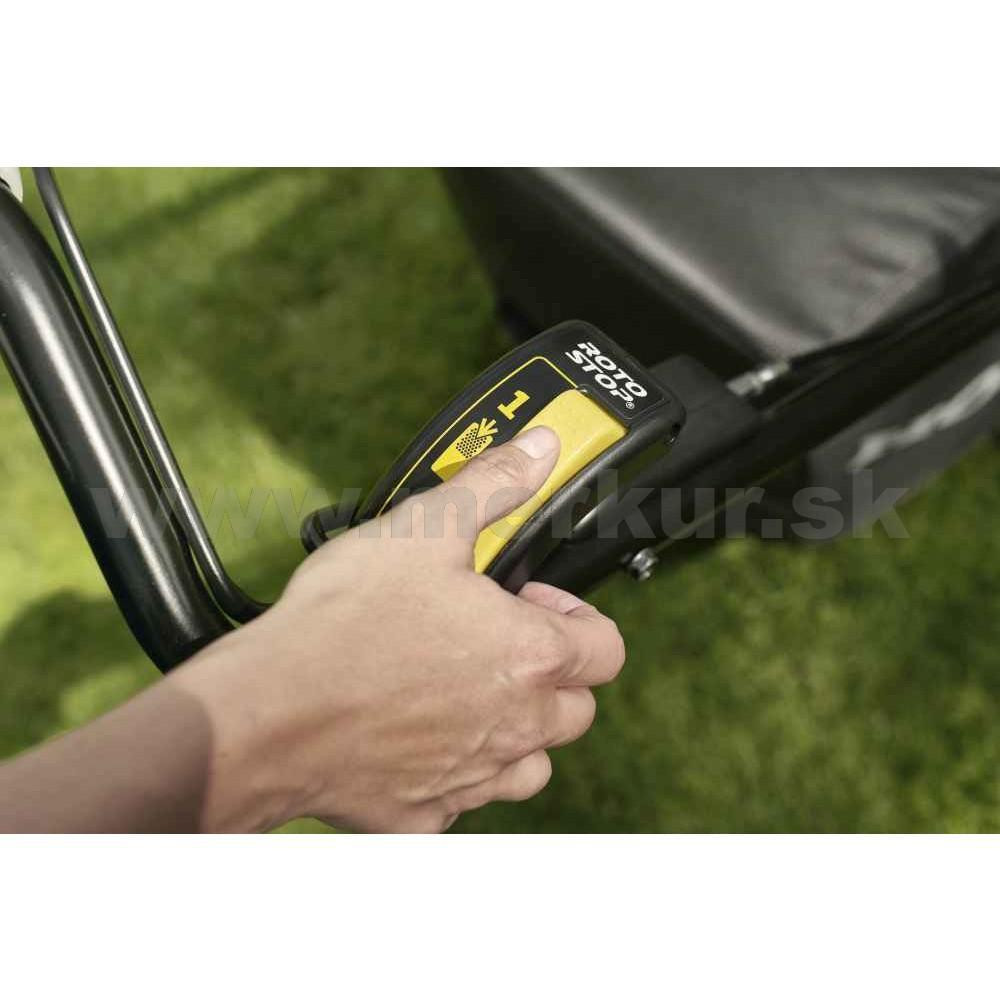 Možnosť vypnutia rotácie noža bez vypnutia motora s funkciou Roto-stop® (disková trecia spojka nožov), nie je nutná námaha na opätovné štartovanie motora napr. po vysýpaní koša na trávu. Samozrejme aj prechádzanie s kosačkou z miesta na miesto je bezpečnejšie v porovnaní s jazdou s rotujúcim nožom.